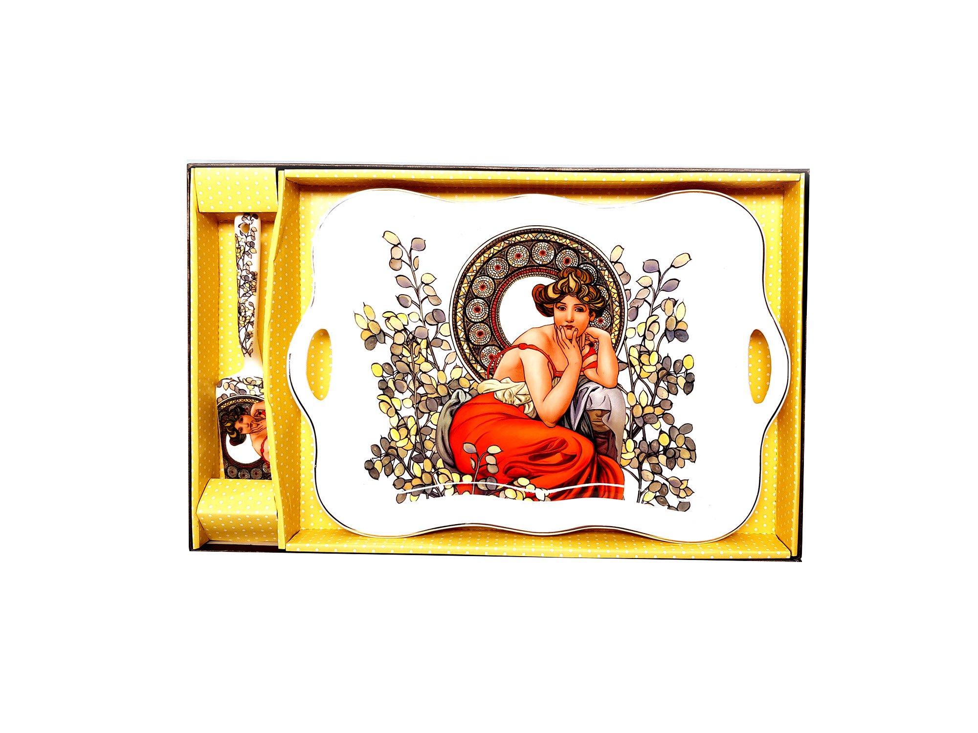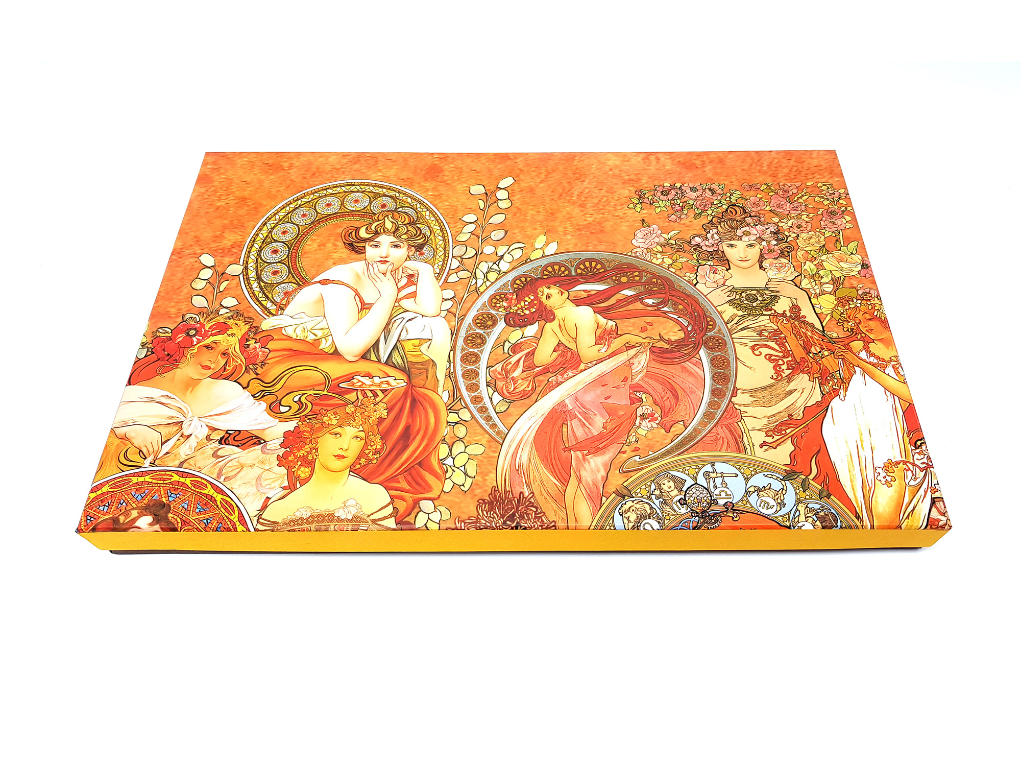 Tác se světoznámým motivem Alfonse Muchy. S dortovou lžicí. Ve stylové papírové krabičce.