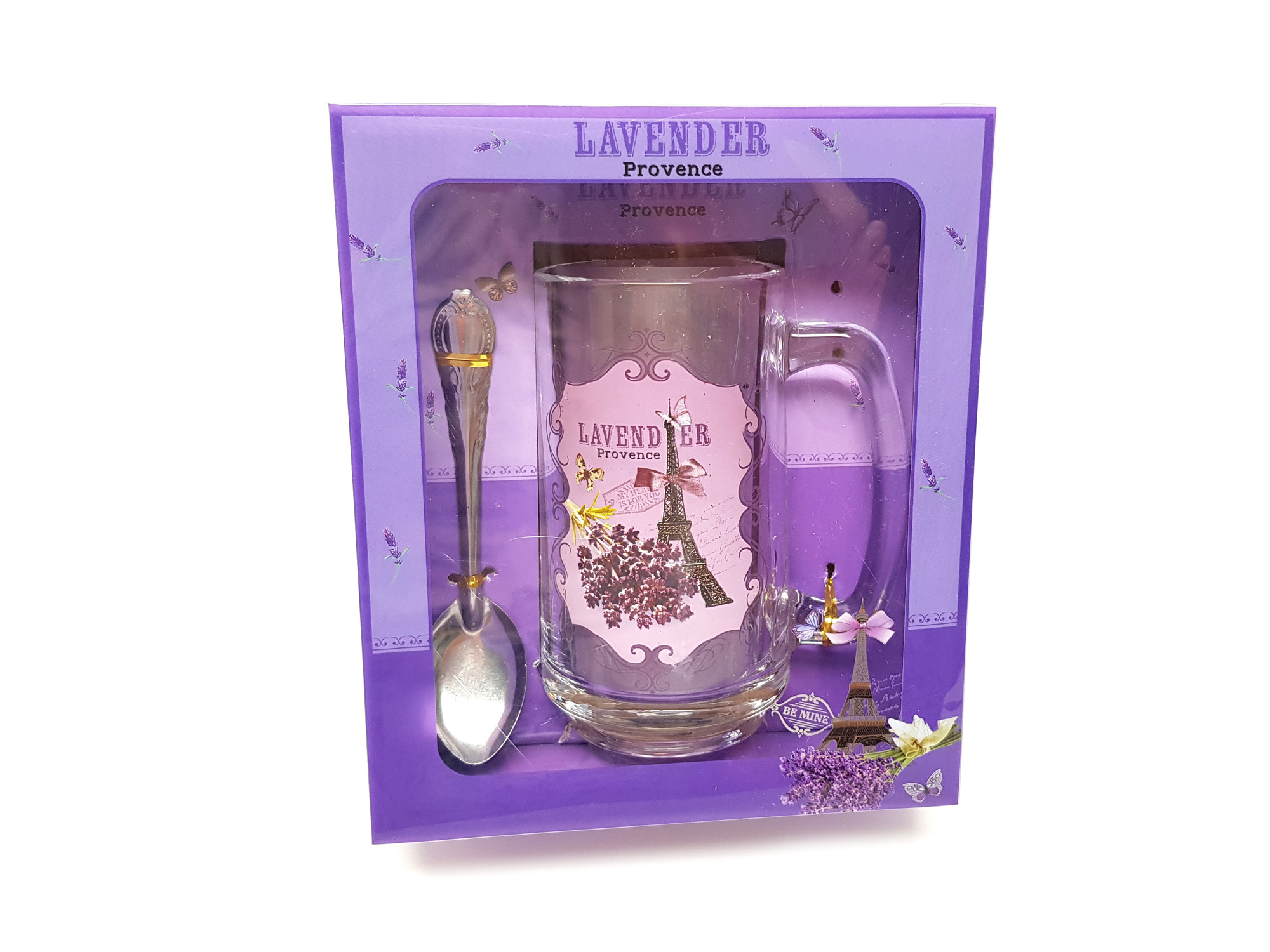 Hrnek z čirého skla s potiskem Eiffelovy věže a levandule v provance stylu s kovovou lžičkou. Krásné dárkové balení.