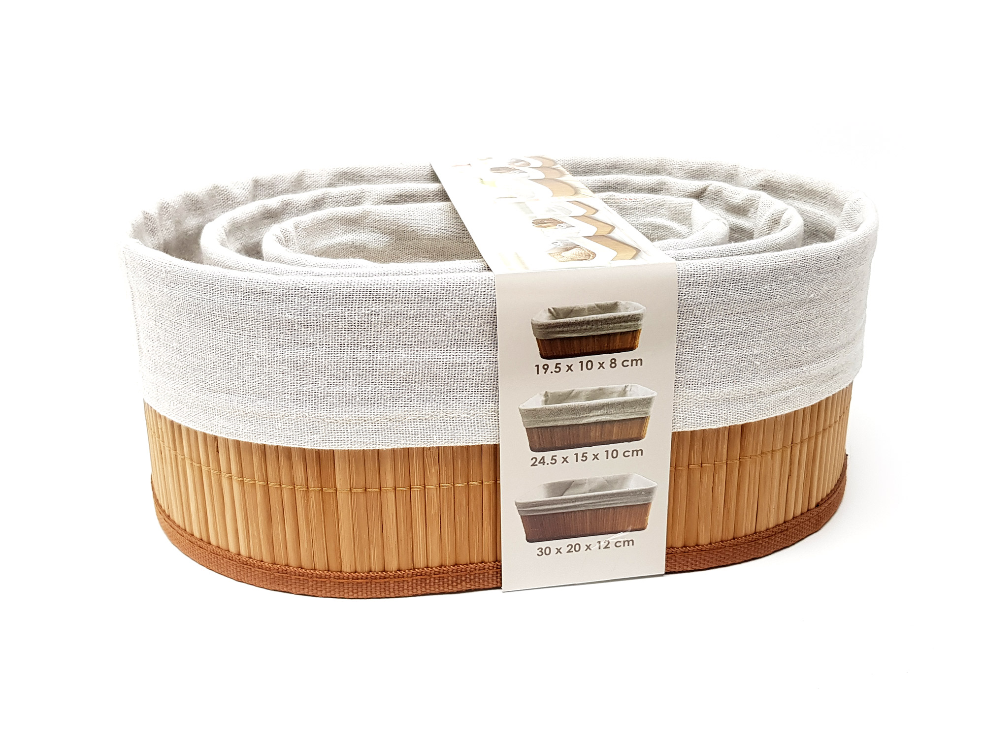 - Sada 3 bambusových košíků s vyjímatelnou látkovou vložkou.Největší košík má rozměry 30 x 20 x 12 cm